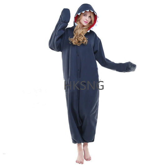 🦈 HKSNG Grey Shark Onesie – Cozy fleece cartoon costume for adults.